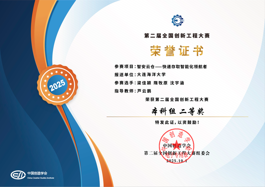 2025年10月,由中国创造学会主办的第二届全国创新工程大赛完成评审,我院人力资源管理专业芦云鹏老师指导的项目团队,凭借作品《智安云仓——快递存取智能化领航者》,成功斩获大赛本科组二等奖。