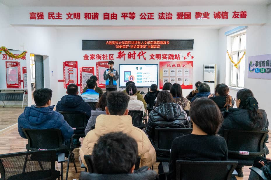 随后,团队转赴沈阳市金家街社区党群服务中心,为社区居民开展了一场“预防电信诈骗”专题公益普法讲座。讲座结合当前高发的电信网络诈骗典型案例,用通俗易懂的语言揭露常见诈骗手法、讲解实用防范技巧,有效增强了社区居民的识骗防骗能力。此次活动不仅向社区传递了实用的法律知识,也让同学们在服务社会中深化了对专业价值的理解,提升了将专业知识转化为服务民生实践的责任感。