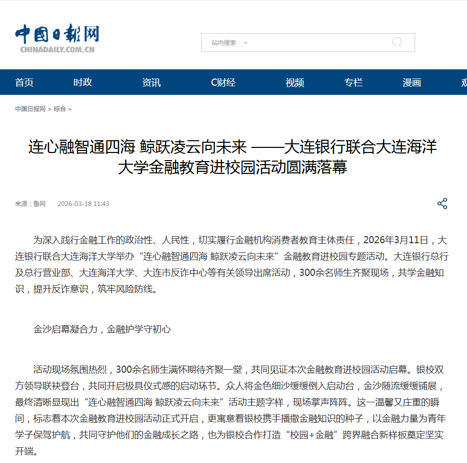 3月18日,中国日报网报道了我院和大连银行联合举行的金融教育进校园活动。